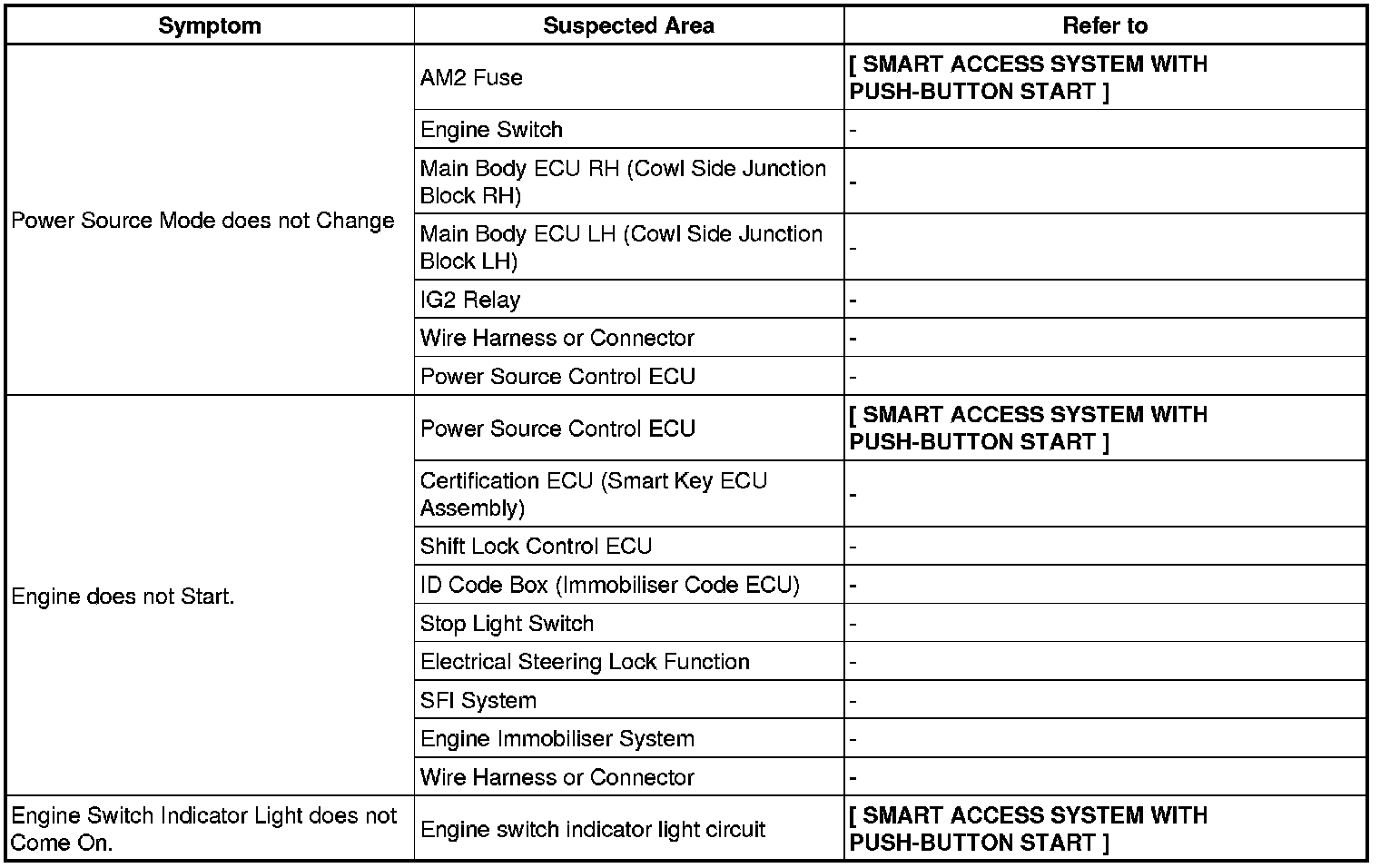 THEFT DETERRENT / KEYLESS ENTRY: SMART ACCESS SYSTEM WITH PUSH-BUTTON START (for Start Function): PROBLEM SYMPTOMS TABLE