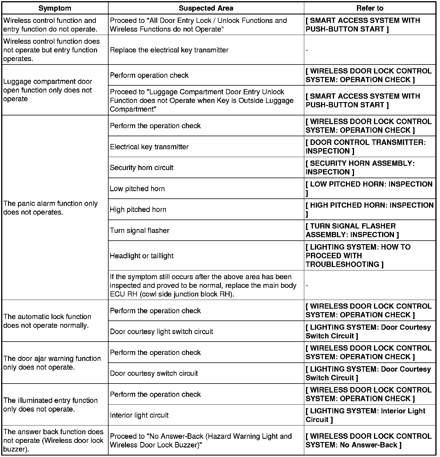 DOOR LOCK: WIRELESS DOOR LOCK CONTROL SYSTEM: PROBLEM SYMPTOMS TABLE