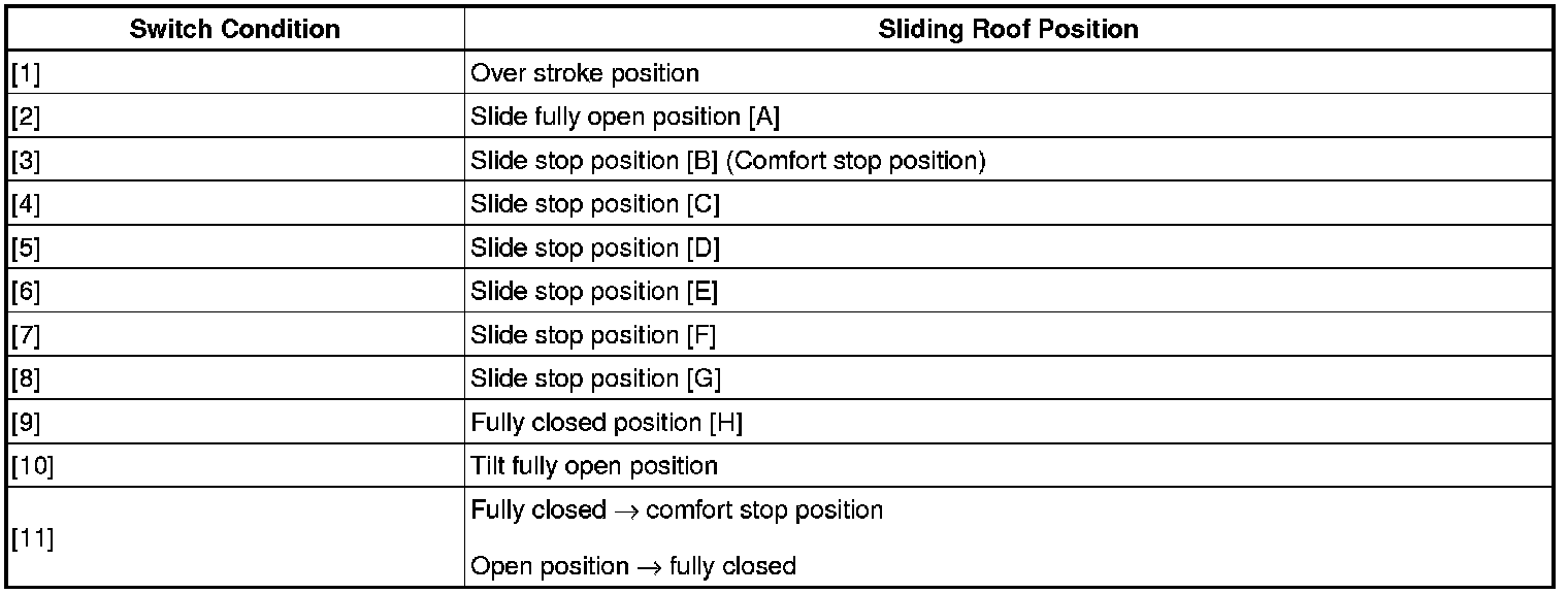 (a) If the jam protection function is operated repeatedly, the fail-safe function will not activate. To return to the normal condition, push the sliding roof switch assembly at position [11] for 10 seconds or more.