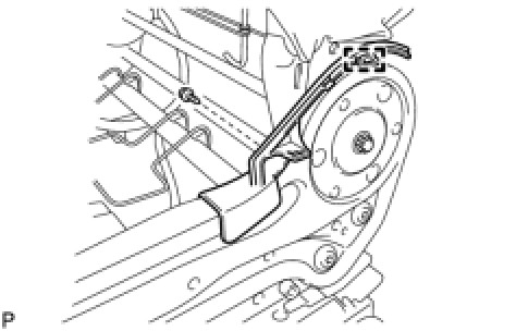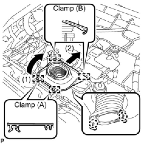 (b) Disengage the 2 clamps (B) in the direction indicated by the arrow (2).