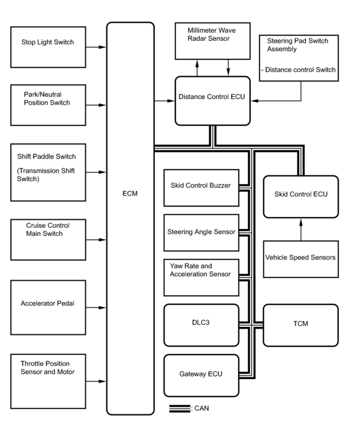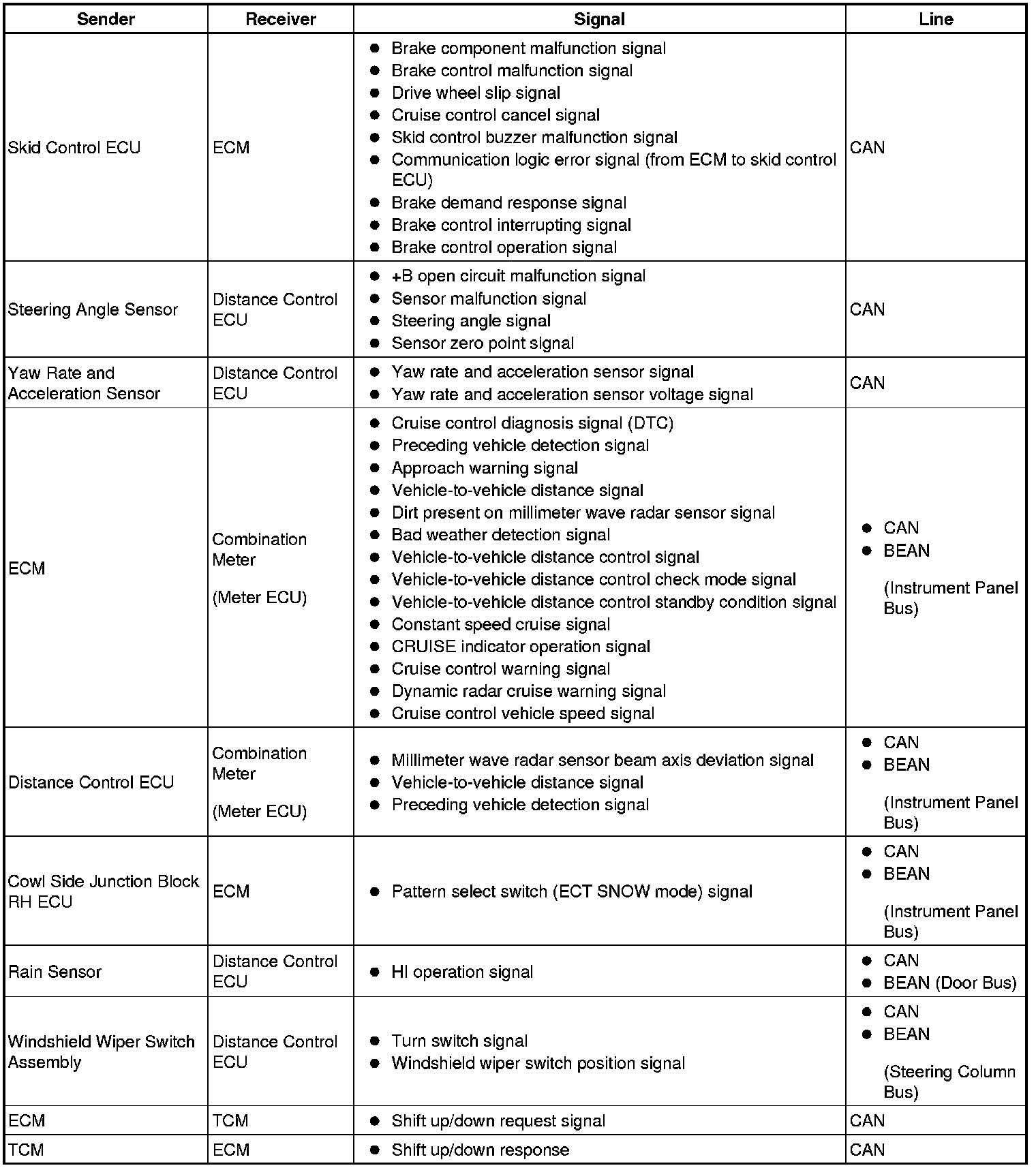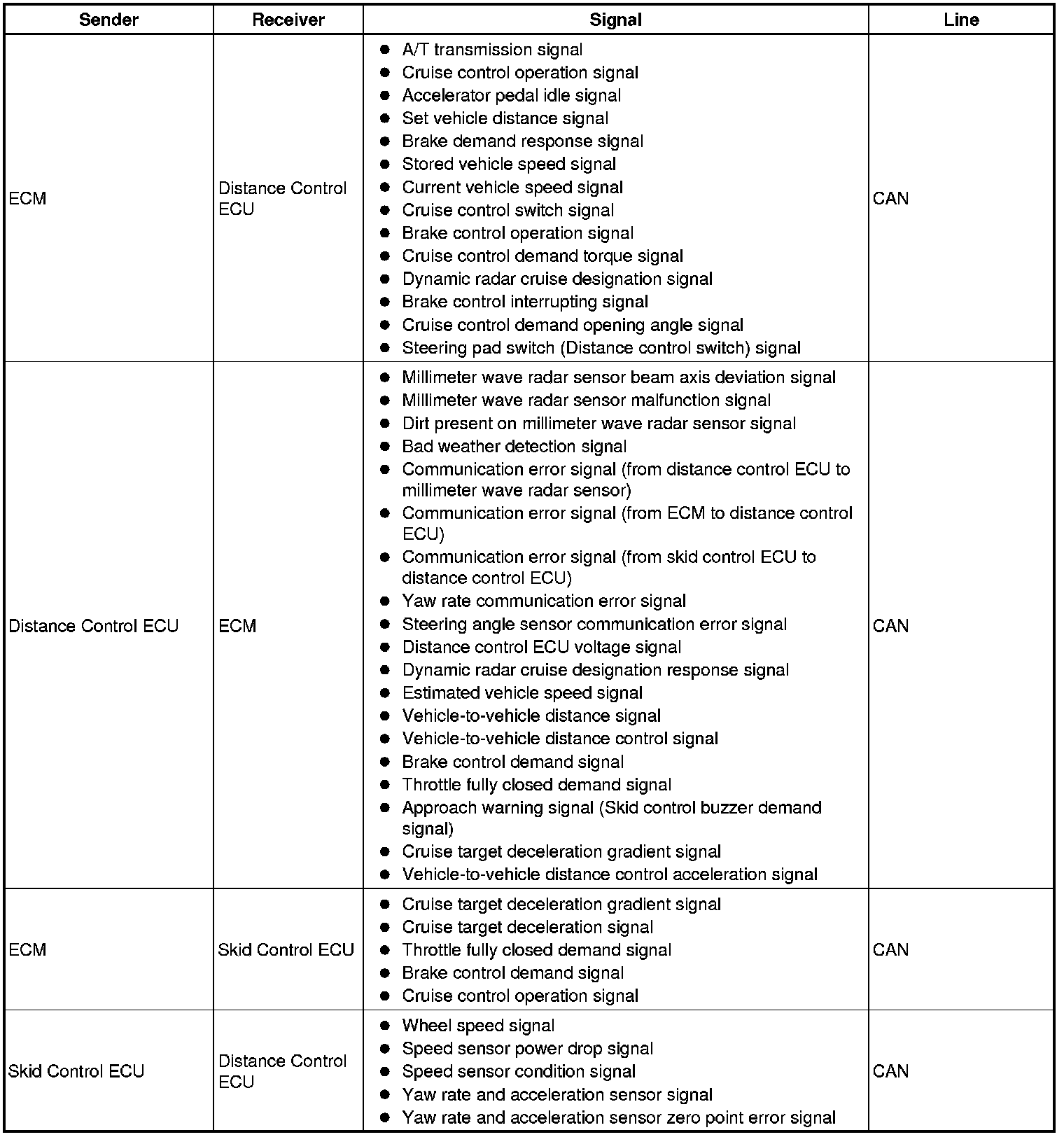 (d) The millimeter wave radar sensor and the distance control ECU control the system while the vehicle-to-vehicle distance control mode is in operation, and send signals to each actuator and ECU.