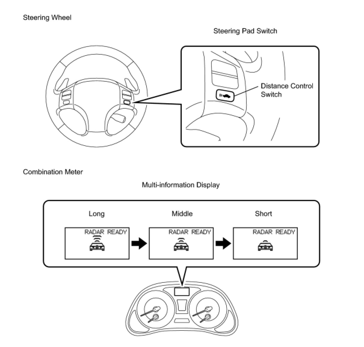 (d) Check that the indication of the vehicle-to-vehicle distance, which is shown on the multi-information display on the combination meter, changes from long to middle to short in that order.