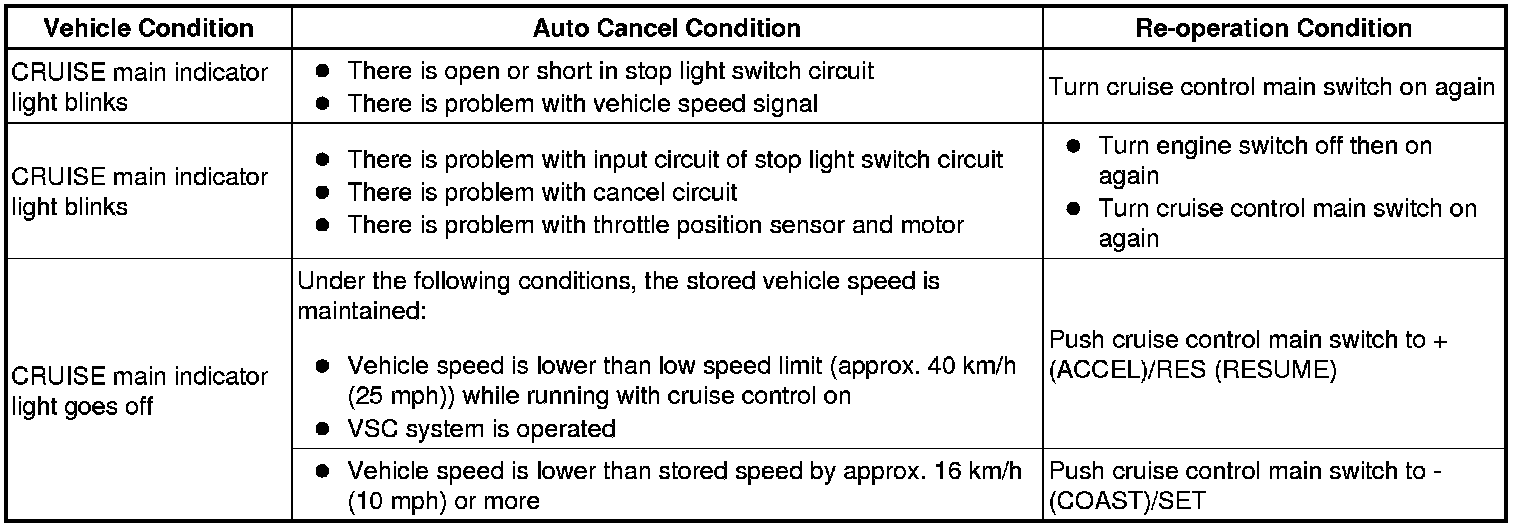 HINT: If the following conditions are detected while the cruise control is in operation, the system clears the stored vehicle speed in the ECM and cancels the cruise control operation.