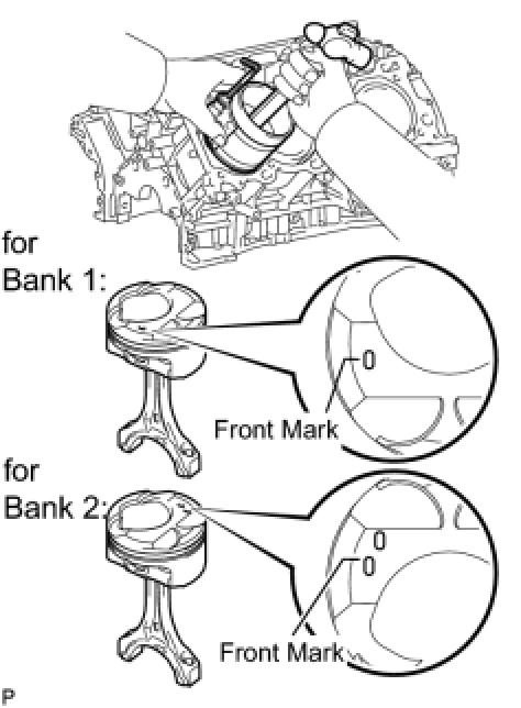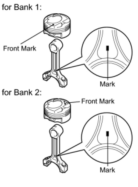 NOTICE: For bank 1, assemble the piston and connecting rod so that the front mark of the piston and mark of the connecting rod face the same direction. For bank 2, assemble so that the front mark of the piston and mark of the connecting rod face the opposite direction.