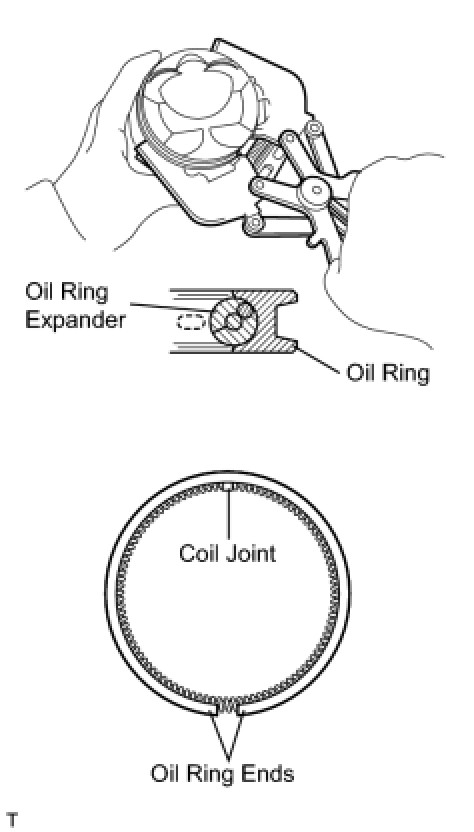 (b) Using a piston ring expander, install the oil ring as shown in the illustration.