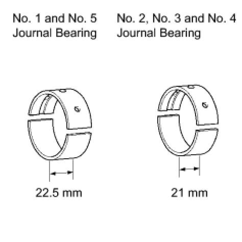 - Main bearings come in widths of 21 mm (0.827 in.) and 22.5 mm (0.886 in.). Install the 22.5 mm (0.886 in.) bearings in the No. 1 and No. 5 cylinder block journal positions with the main bearing caps. Install the 21 mm (0.827 in.) bearings in the No. 2, No. 3 and No. 4 positions.