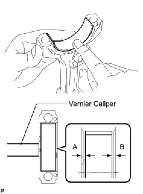 (2) Using a vernier caliper, measure the distance between the bearing cap's edge and the lower bearing's edge.