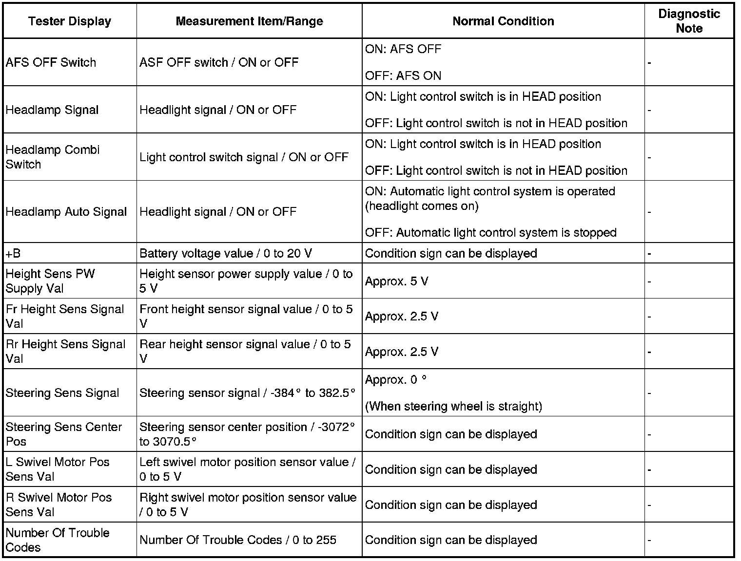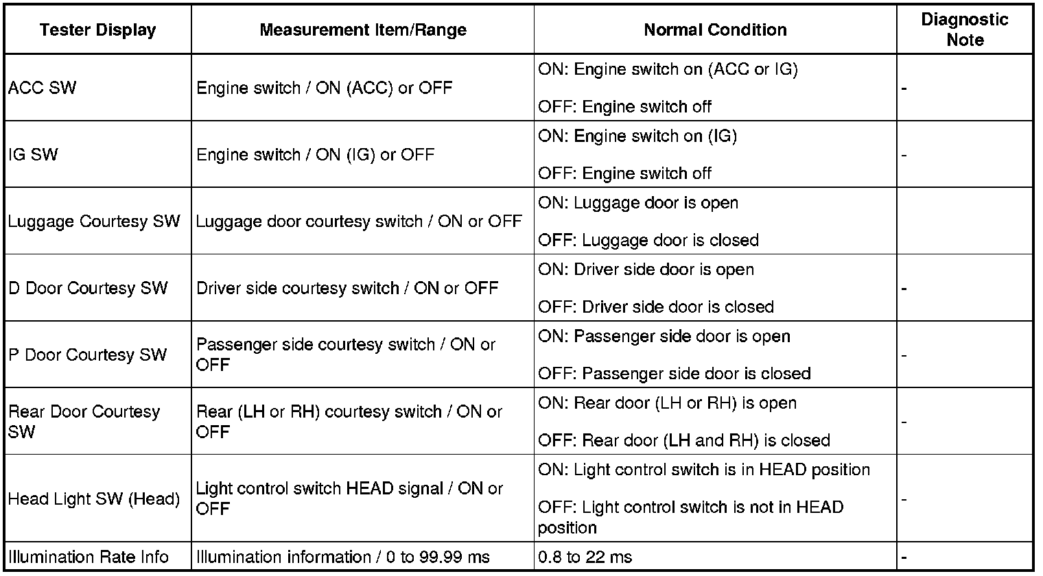 HINT: Using the Techstream to read the Data List allows the values or states of switches, sensors, actuators and other items to be read without removing any parts. This non-intrusive inspection can be very useful because intermittent conditions or signals may be discovered before parts or wiring is disturbed. Reading the Data List information early in troubleshooting is one way to save diagnostic time.