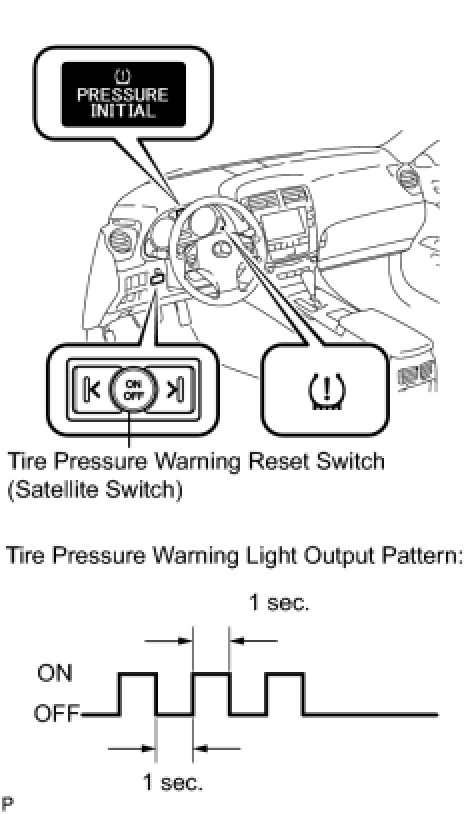 (b) Press and hold the tire pressure warning reset switch (satellite switch) for 3 seconds or more so that the tire pressure warning light blinks 3 times (1 second on, 1 second off) and "PRESSURE INITIAL" is displayed on the multi-information display.