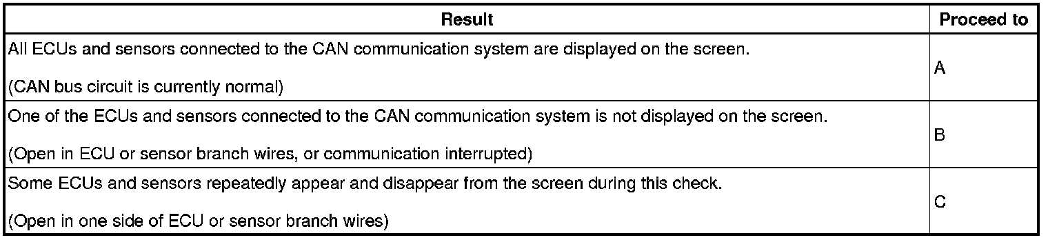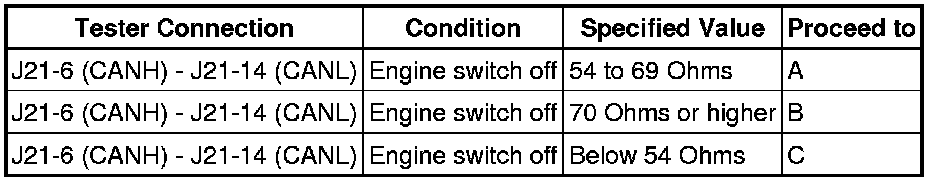 - ECUs related to a problem in the CAN bus will store DTCs to indicate communication malfunctions. The communication stop mode in the CAN bus can be determined by comparing the combination of DTCs that have been set. Refer to the DTC combination table for the CAN bus.