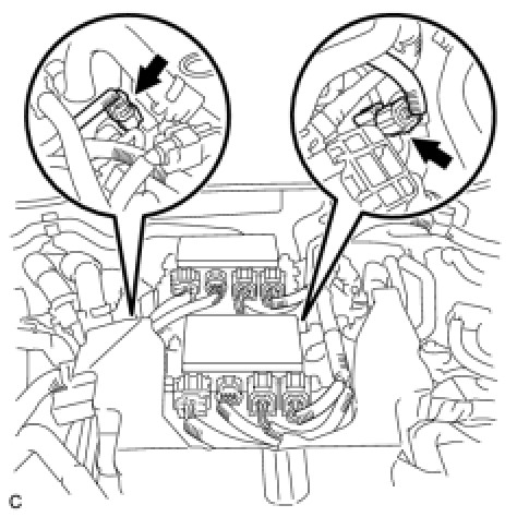 (4) Disconnect the 4 connectors with wire harness locks from the 2 injector drivers.