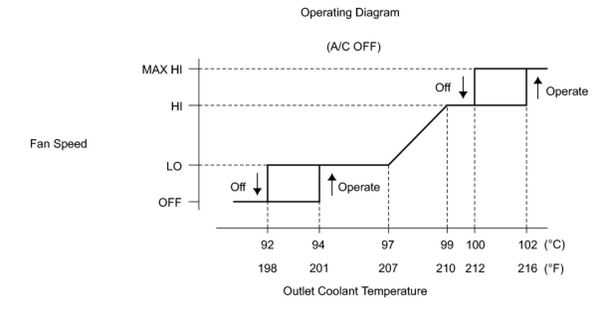 - The coolant temperature at which the fans start operating is approximately 94°C (201°F).