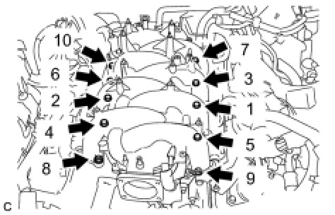 INTAKE AIR SURGE TANKTemporarily install the intake air surge tank assembly with the 2 nuts and 8 bolts. Then tighten the 2 nuts and 8 bolts uniformly in the order shown in the illustration.