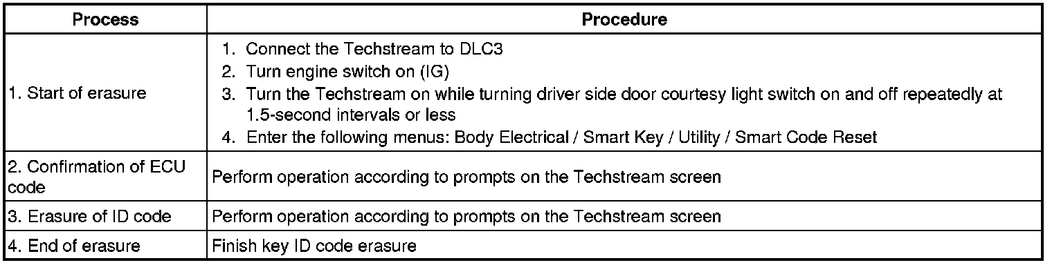 *1: Perform this process for one of the keys registered for the vehicle. Finish the procedure within 30 seconds. If the procedure has not been finished within the specified time, perform the erasure procedures again from process 1.