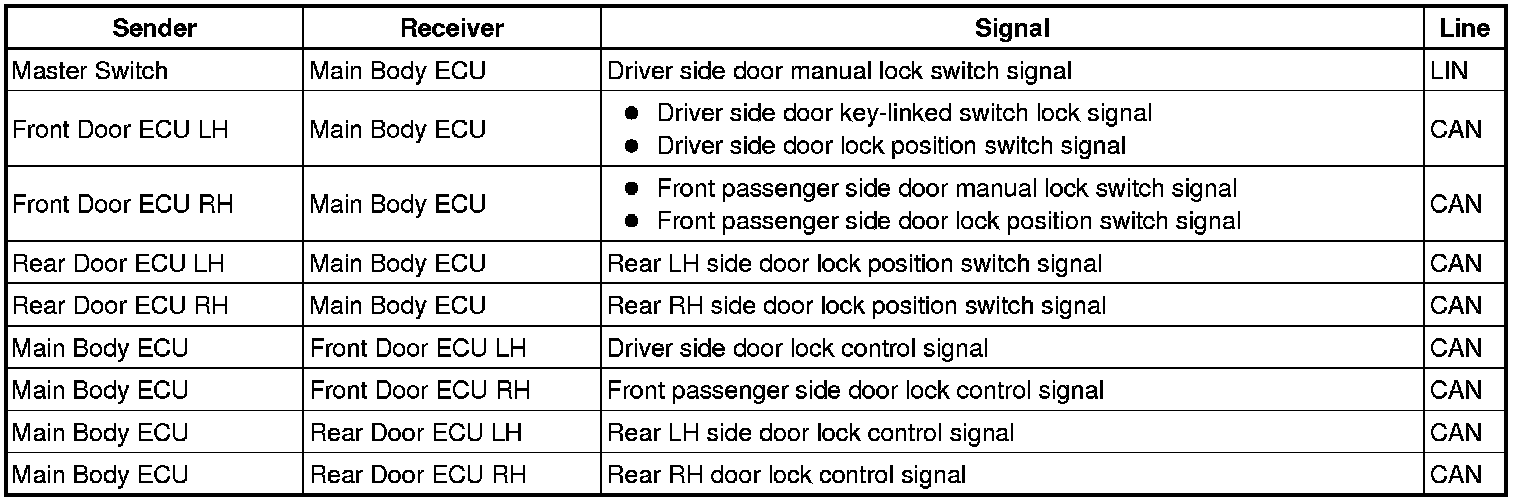 - The door control switch on the passenger door uses the CAN line to send lock / unlock request signals through the front door ECU RH to the main body ECU.
