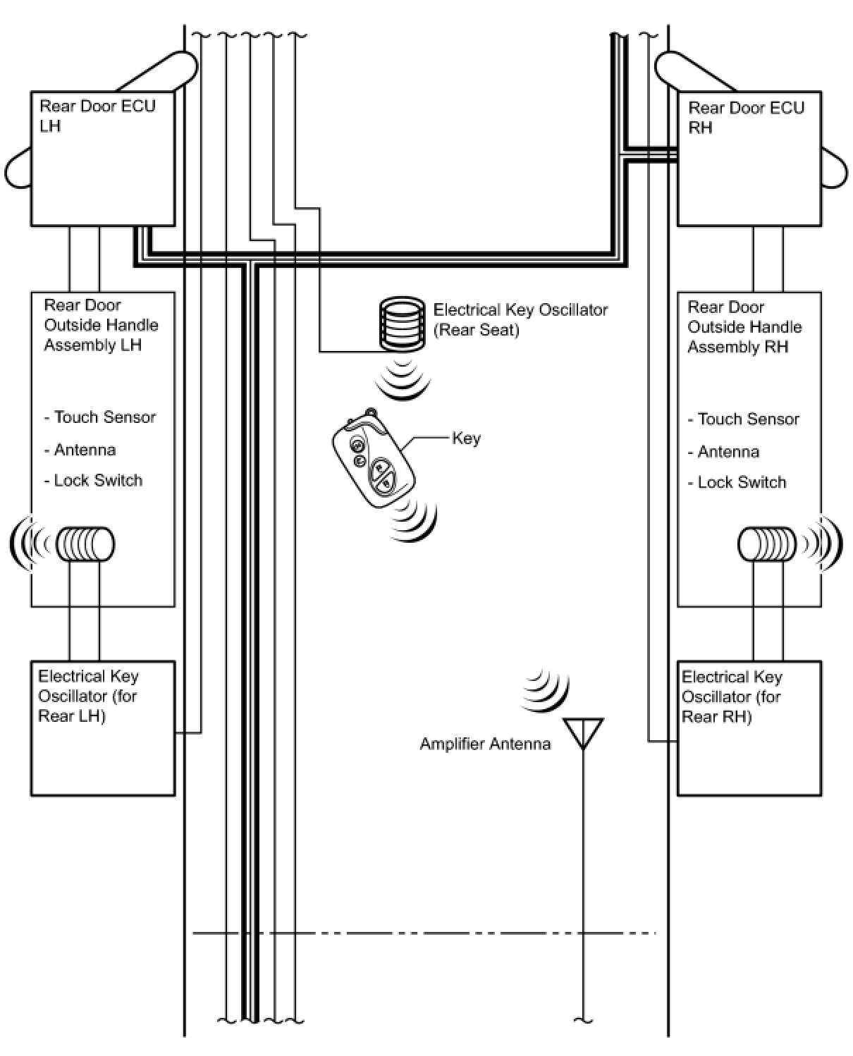 - The detection area of each door oscillator is formed by transmitting a request signal every 0.25 seconds while the engine switch is off and each door is locked. In this way, it detects the proximity of a key. During entry lock, the detection area is formed with the lock switch ON.