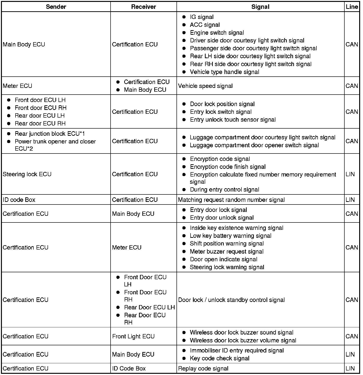 - This system is controlled by the certification ECU. When the certification ECU detects the presence of the key in one of the detection areas, it identifies and checks the ID code, and outputs operation signals to the related ECU in accordance with their functions.