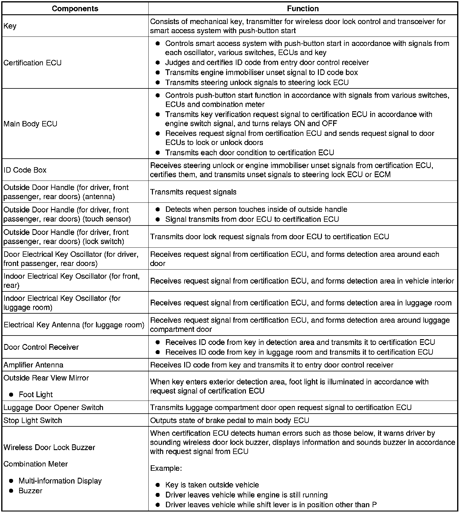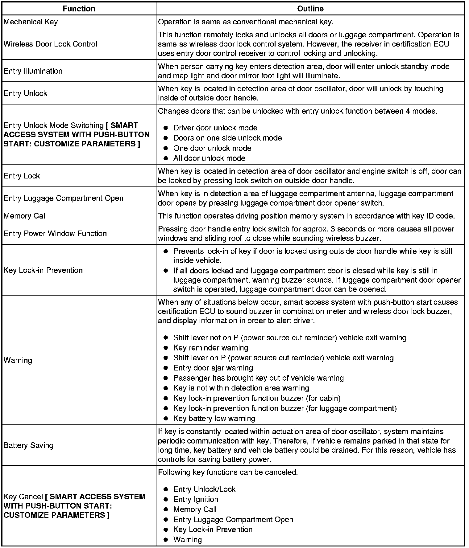 (a) In addition to conventional mechanical key and wireless door lock control functions, the smart access system with push-button start enables door locking/unlocking, steering lock releasing, engine starting and luggage compartment door opening without operating the key. The only requirement is that the key is in the user's possession.