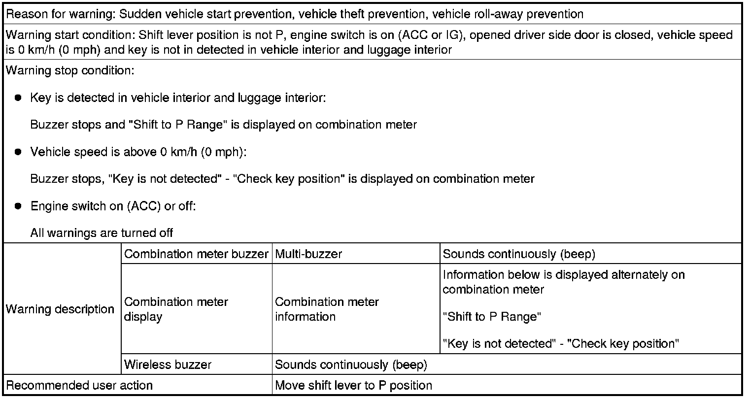 (1) Pattern 1: With shift lever on P, driver door is opened, key is brought out of vehicle, driver door is closed, and movement away from vehicle is attempted