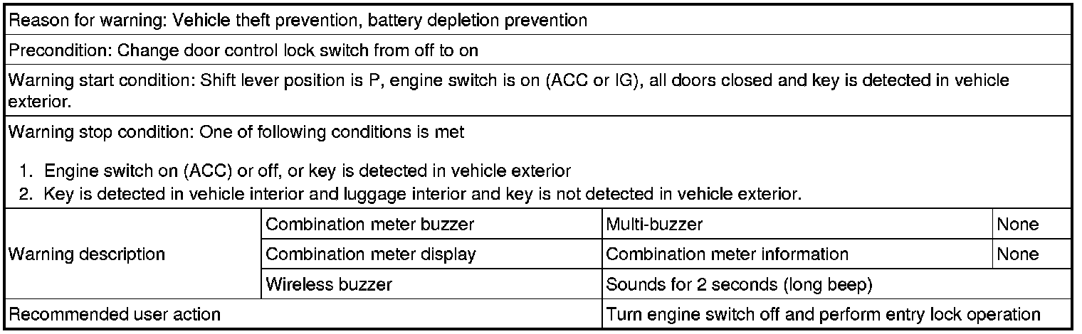 (d) If the key is located inside of the cabin, the door lock function will not operate and the alarm buzzer (beep sound) will sound for 2 seconds.