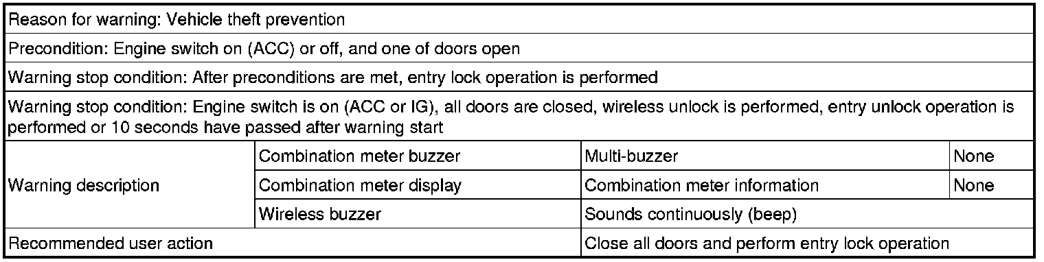 (2) With shift lever on P and either engine switch on (ACC) or steering lock / unlock set, driver door is opened, move away from vehicle is performed, and door handle lock switch is pressed in an attempt to perform entry lock operation