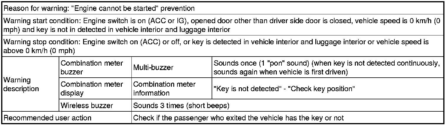 (1) With engine switch in position other than off, key is brought out of vehicle by passenger