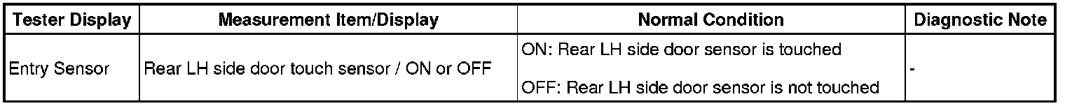 If the rear left door entry unlock function does not operate but the entry lock operation operates, the communication line between the vehicle and electrical key transmitter is normal. Either of the following may have occurred: 1) the door outside handle touch sensor is malfunctioning; or 2) the rear door ECU LH receives the door outside handle touch sensor ON signal, but is unable to send the signal to the certification ECU through CAN communication.