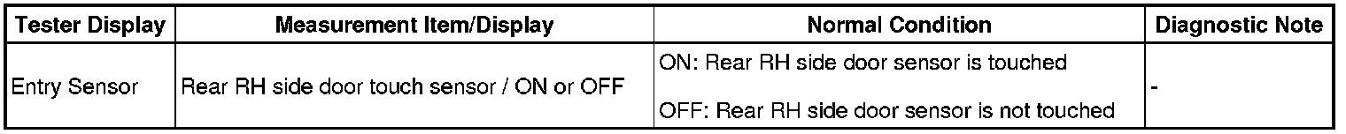 If the rear right door entry unlock function does not operate but the entry lock operation operates, the communication line between the vehicle and electrical key transmitter is normal. Either of the following may have occurred: 1) the door outside handle touch sensor is malfunctioning; or 2) the rear door ECU RH receives the door outside handle touch sensor ON signal, but is unable to send the signal to the certification ECU through CAN communication.