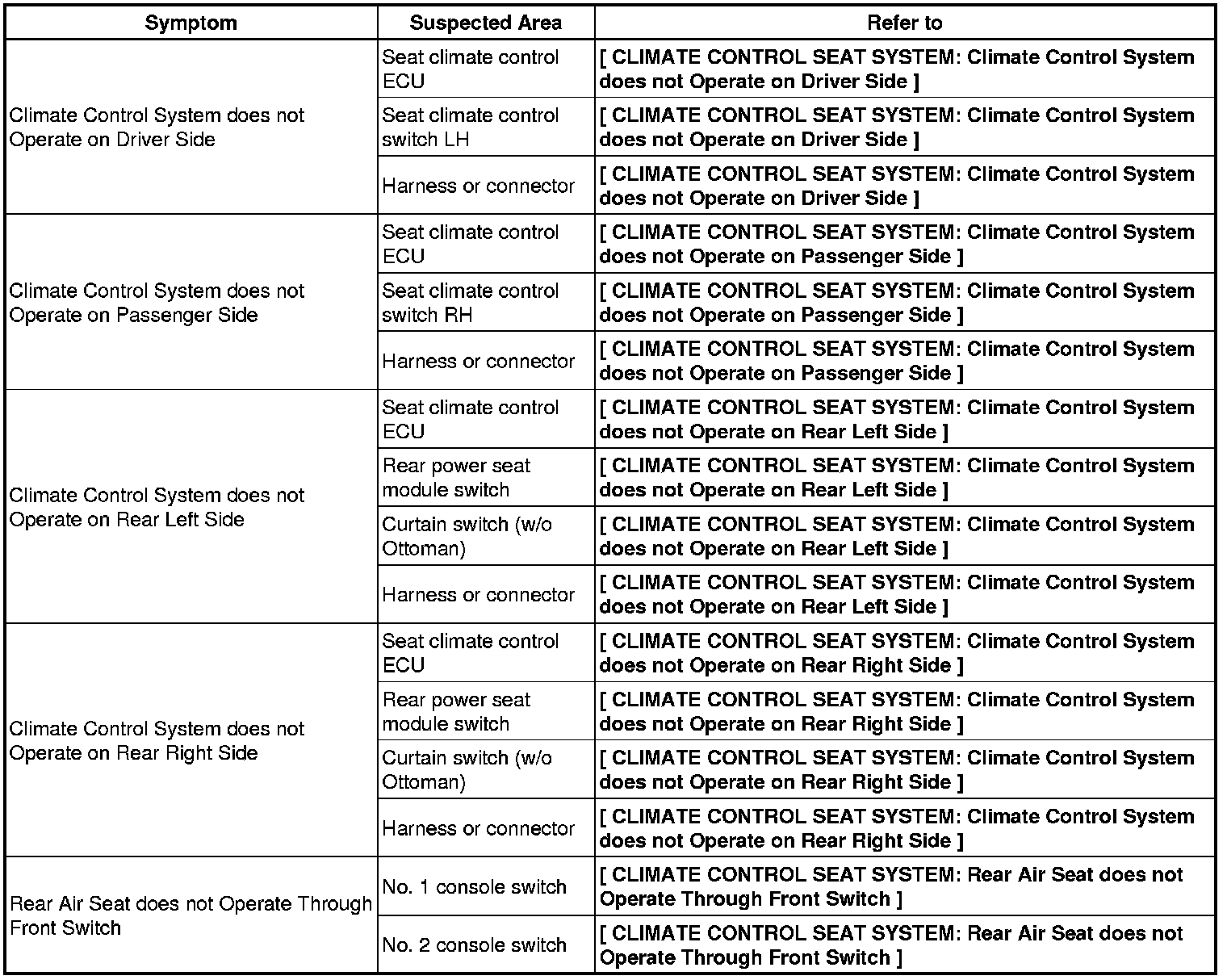 SEAT: CLIMATE CONTROL SEAT SYSTEM: PROBLEM SYMPTOMS TABLE