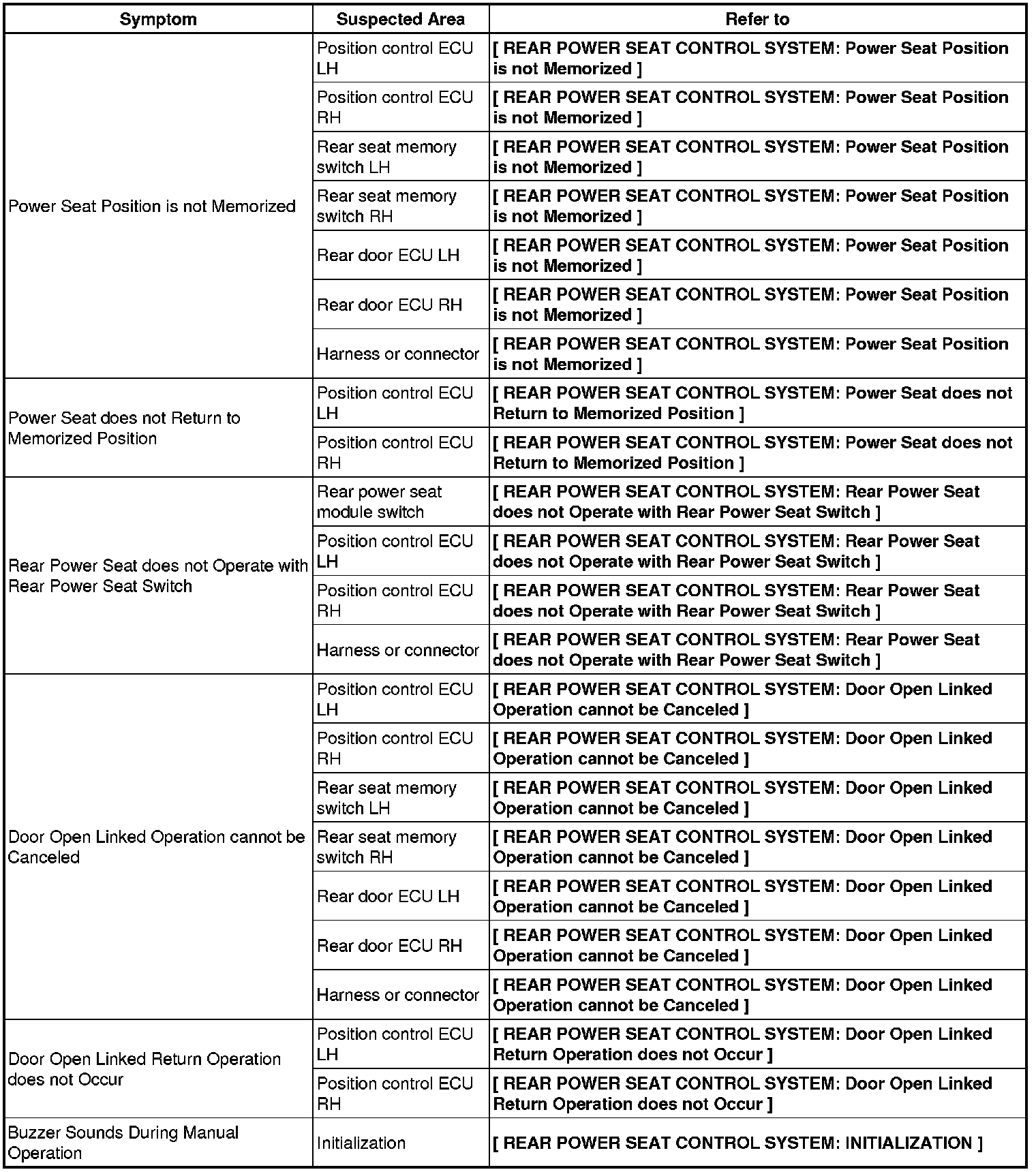SEAT: REAR POWER SEAT CONTROL SYSTEM: PROBLEM SYMPTOMS TABLE