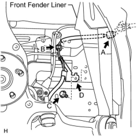 (a) Disconnect the front fender liner so that the skid control sensor wire connector (labeled A) can be seen.
