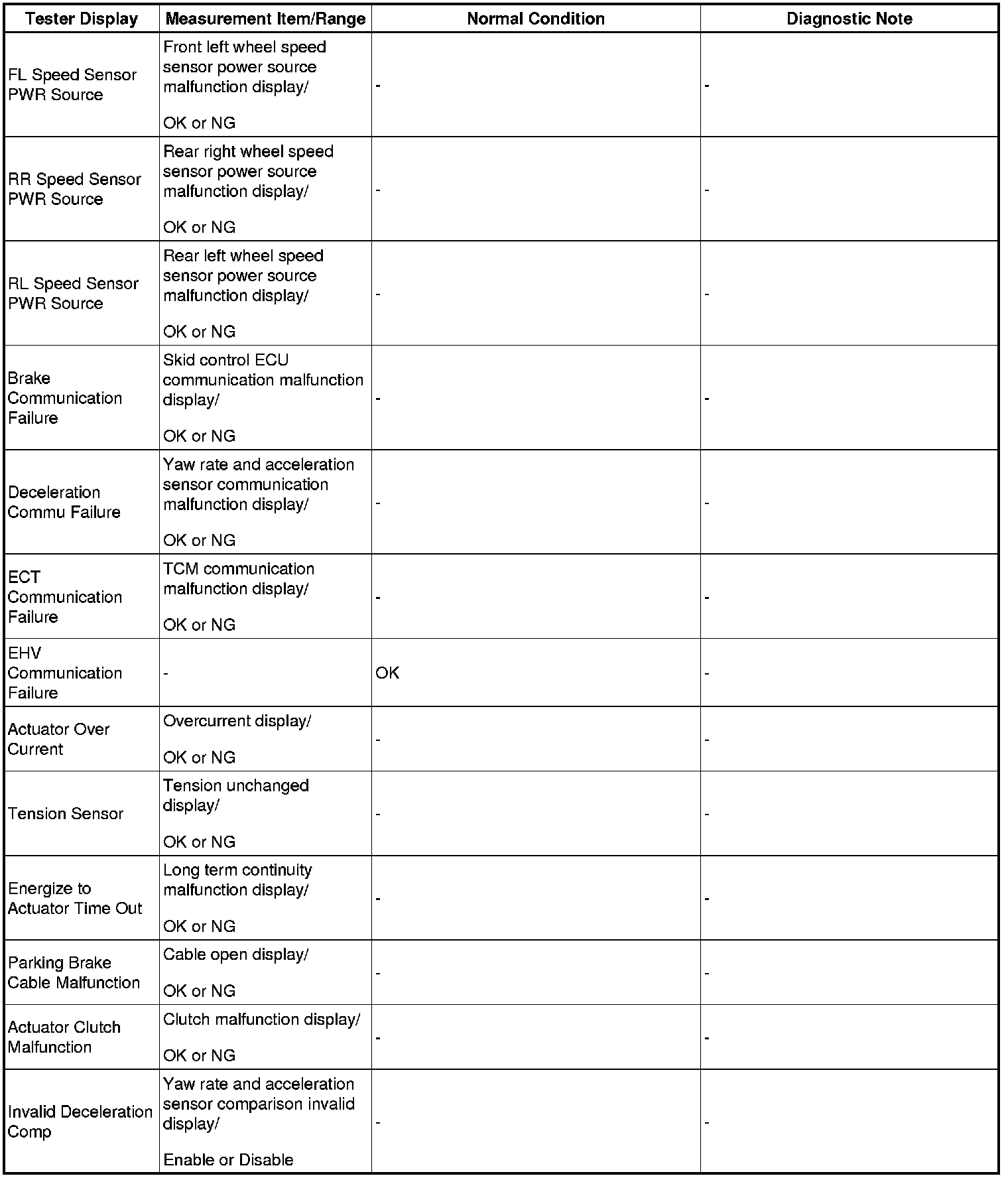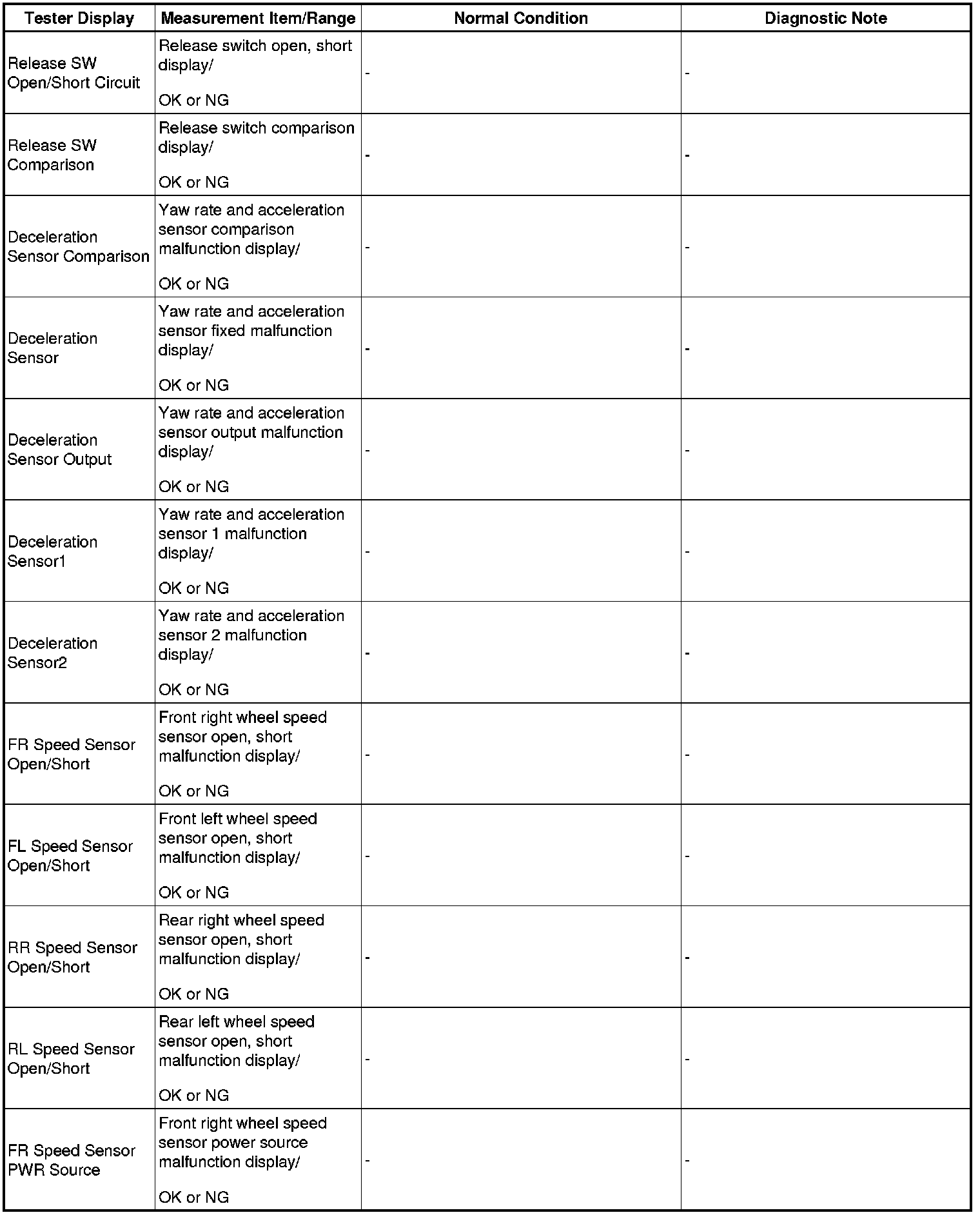 NOTE: In the table below, the values listed under "Normal Condition" are reference values. Do not depend solely on these reference values when deciding whether a part is faulty or not.