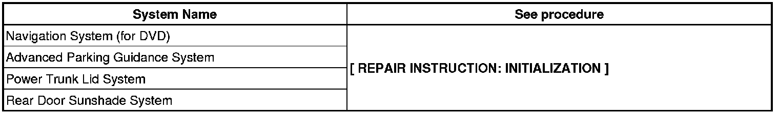 NOTE: When disconnecting the cable from the negative (-) battery terminal, initialize the following system after the cable is reconnected.