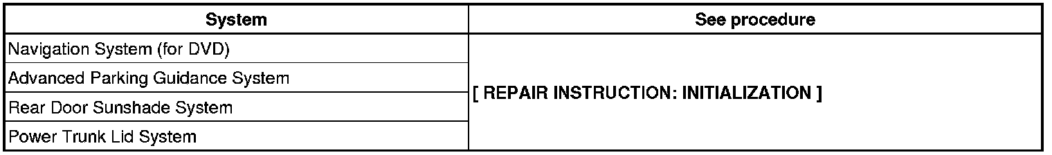 NOTE: When disconnecting the cable from the negative (-) battery terminal, initialize the following systems after the cable is reconnected.