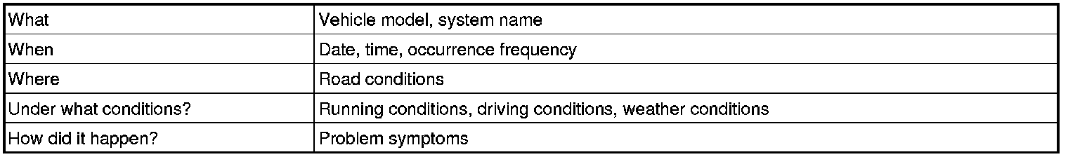 HINT: The most difficult case in troubleshooting is when no problem symptoms occur. In such a case, a thorough problem analysis must be carried out. A simulation of the same or similar conditions and environment in which the problem occurred in the customer's vehicle should be carried out. No matter how much skill or experience a technician has, troubleshooting without confirming the problem symptoms will lead to important repairs being overlooked and mistakes or delays.