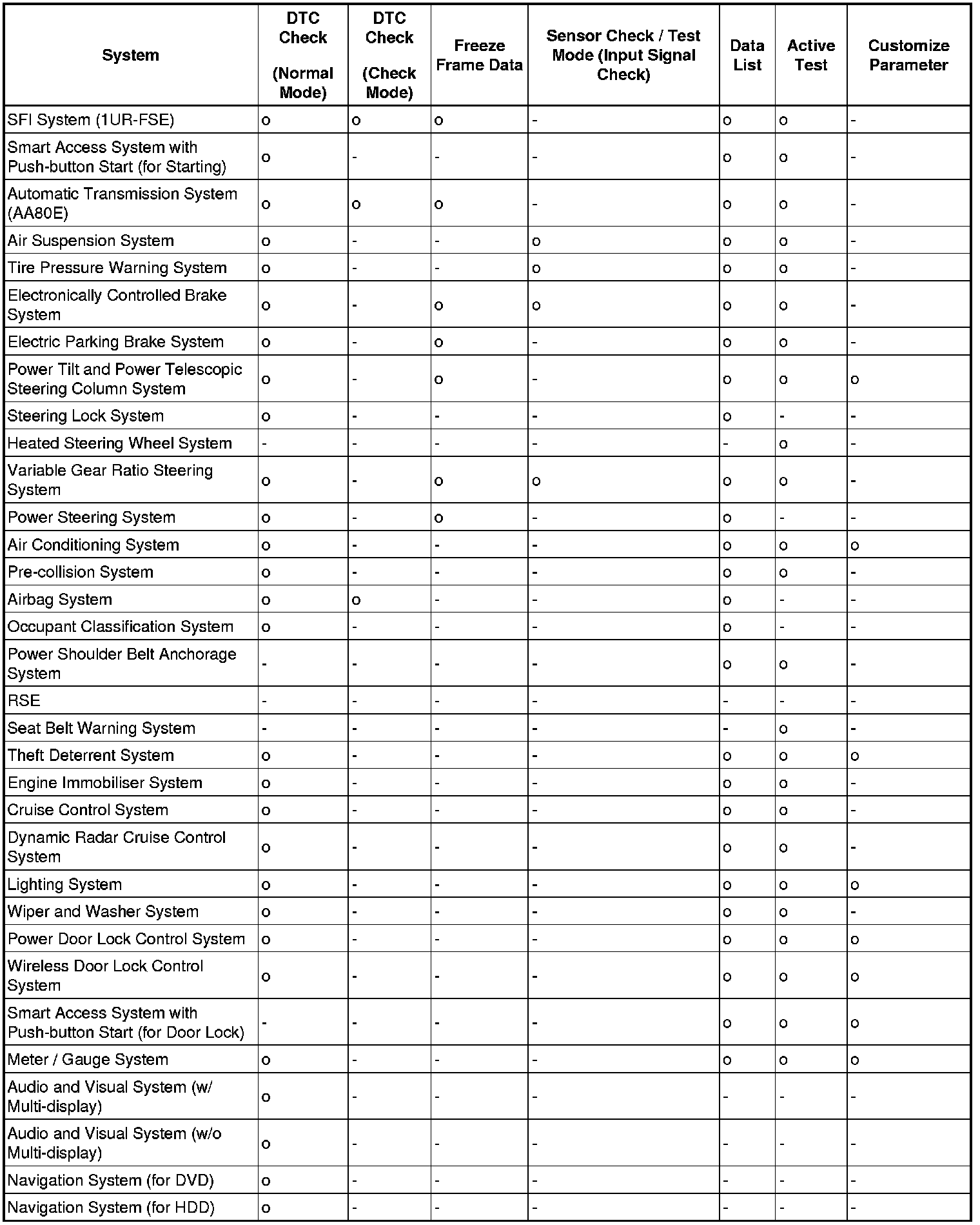 By using these functions, the problem areas can be narrowed down and troubleshooting is more effective. Diagnostic functions are incorporated in the following systems in the LEXUS LS460L / LS460.