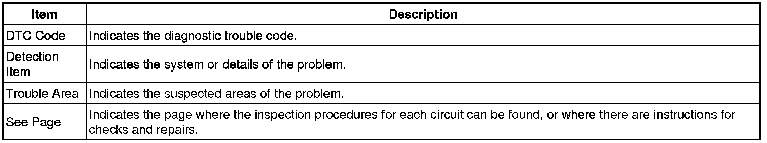 Look for output Diagnostic Trouble Codes (DTCs) (from the DTC checks) in the appropriate section's Diagnostic Trouble Code Chart. Use the chart to determine the trouble area and the proper inspection procedure. A description of each of the chart's columns is below.
