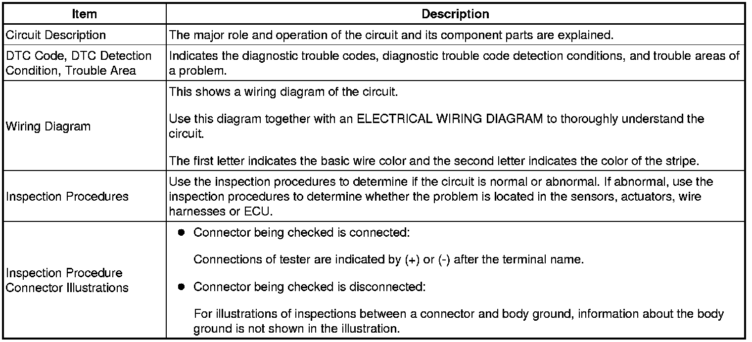 When a "Normal" code is output during a DTC check but the problem is still occurring, use the Problem Symptoms Table. The suspected areas (circuits or parts) for each problem symptom are in the table. The suspected areas are listed in order of probability. A description of each of the chart's columns is below.