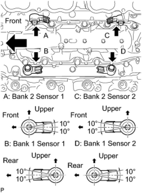 (a) Install the 4 knock sensors with the 4 bolts so that the sensors are angled as shown in the illustration.