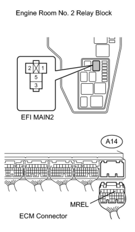 When the engine switch is turned on (IG), voltage from the ECM's MREL terminal is applied to the EFI relay (EFI MAIN2). This causes the contacts of the EFI relay (EFI MAIN2) to close, which supplies power to terminal +B and +B2 of the ECM.