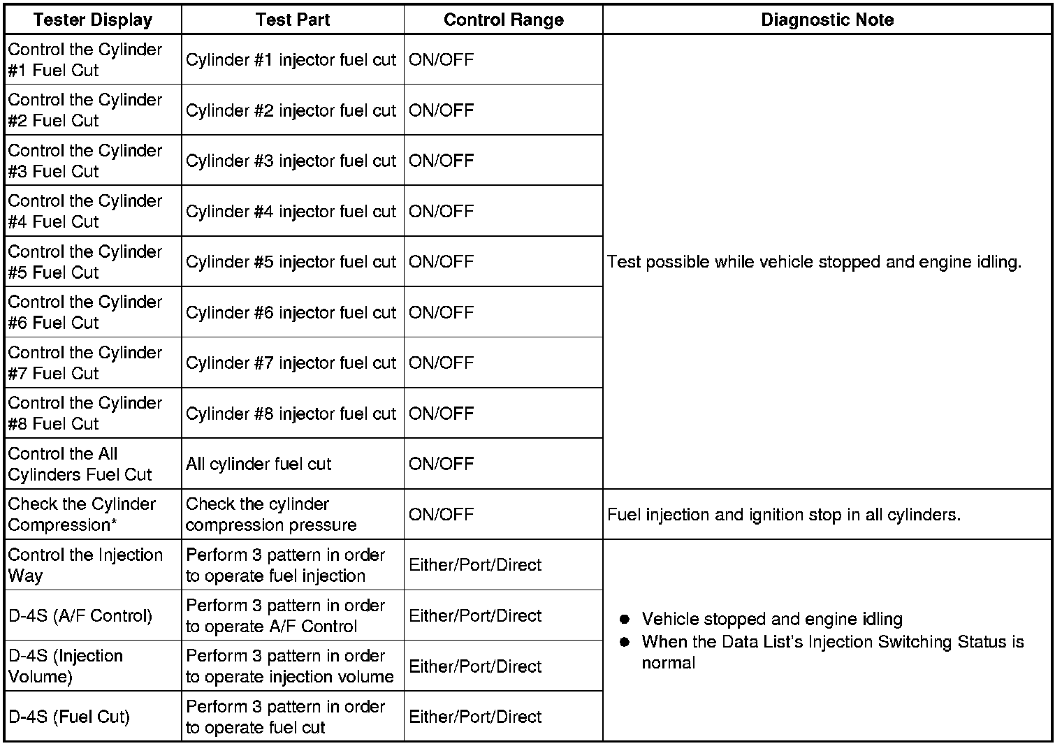 In this Active Test, the fuel and ignition of all cylinders are cut, and cranking occurs for approximately 10 seconds. Then, each cylinder measures the engine rpm. If a cylinder's engine rpm is higher than the other, that cylinder's compression pressure is compared to the other, and is determined whether it is low or not.