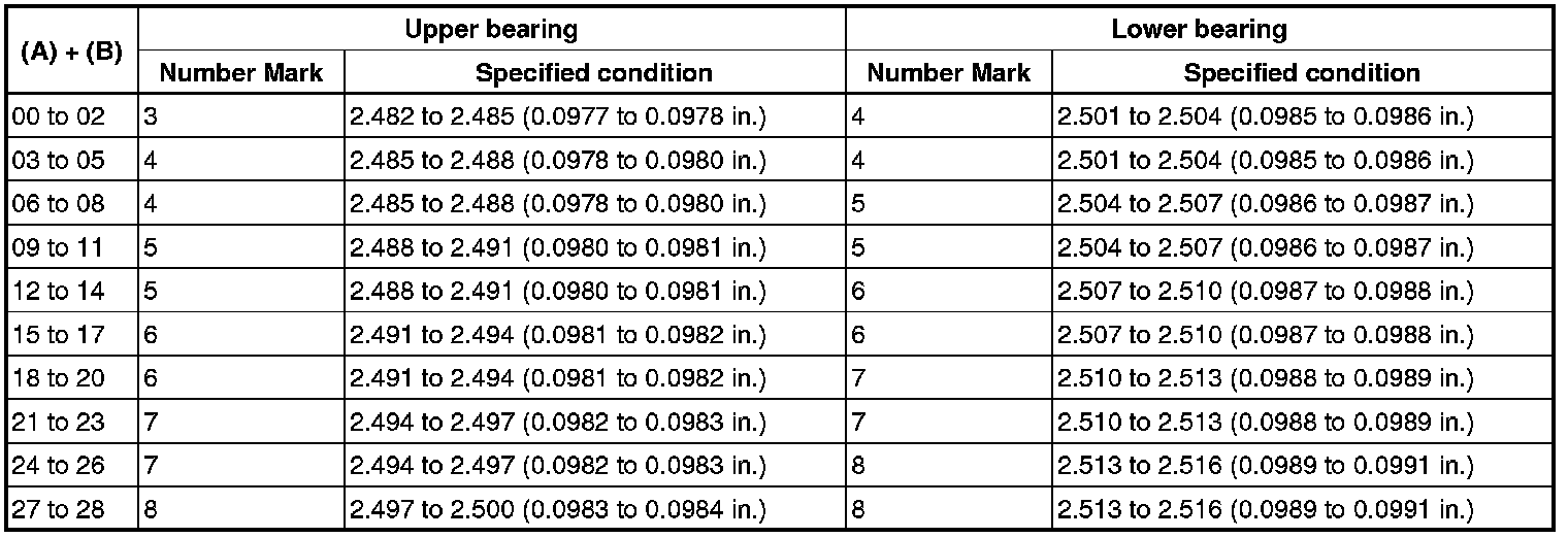 HINT: If replacing a bearing, replace it with one having the same number. If the number of the bearing cannot be determined, select the correct bearing by adding together the numbers imprinted on the cylinder block and crankshaft. Refer to the table for the appropriate bearing number. There are 6 sizes of standard bearings. For No. 1 and No. 5 position bearings, use bearings marked 4, 5, 6, 7, 8 and 9. For other position bearings, use bearing marked 3, 4, 5, 6, 7 and 8.