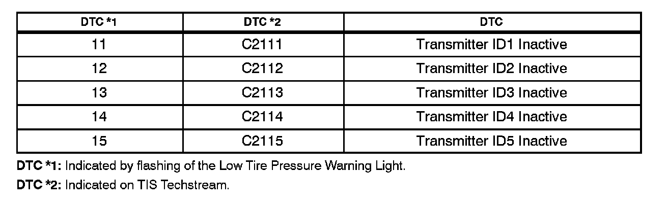 ^ The Diagnostic Trouble Codes (DTCs) listed below are stored in the TPWS ECU until the tire pressure warning valves/sensors are activated.