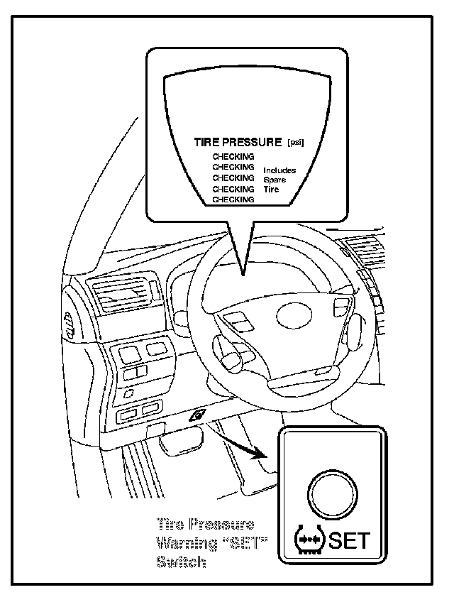Make sure that the "Tire Pressure Reset Proceeding" appears on the multi-information display. After a few seconds, the display changes to "CHECKING" (which means the tire pressures are being measured). It is necessary for the ignition to be in the "IG-ON" mode a maximum of 5 minutes for initialization to complete correctly.