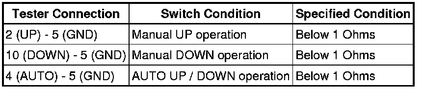 - If the result is not as specified, replace the power window regulator switch assembly.