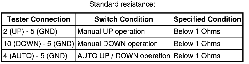 - If the result is not as specified, replace the power window regulator switch assembly.