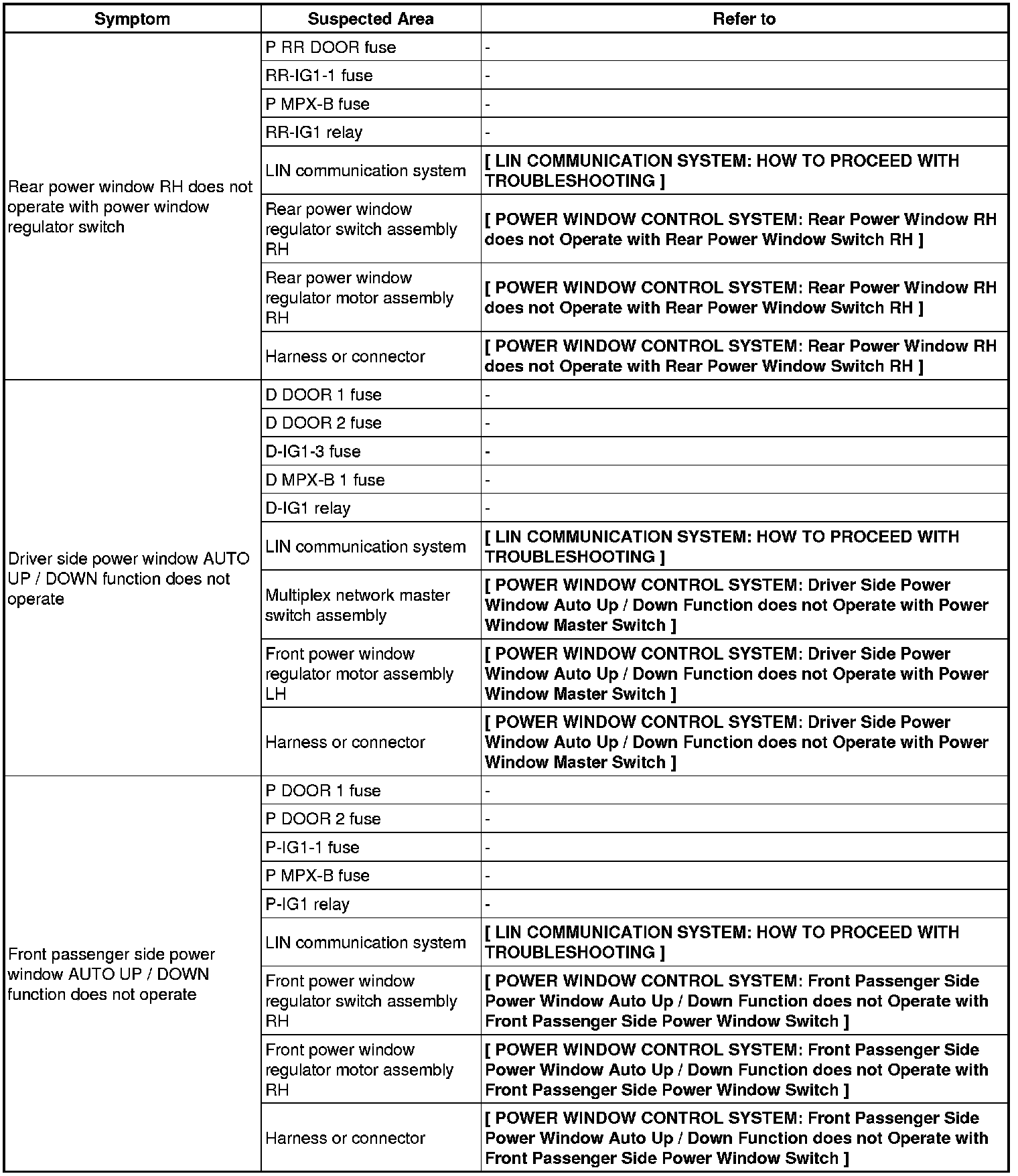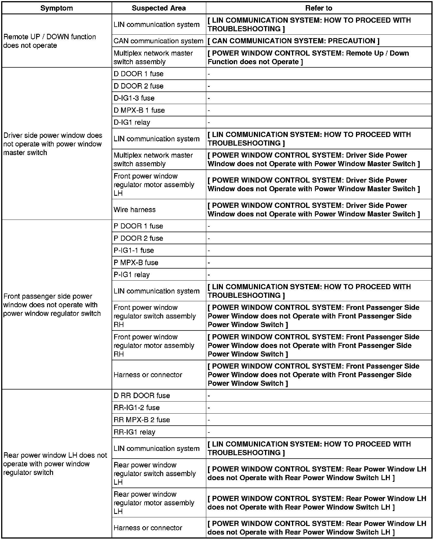 WINDSHIELD / WINDOWGLASS: POWER WINDOW CONTROL SYSTEM: PROBLEM SYMPTOMS TABLE