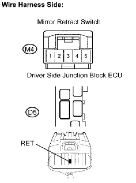 The operating condition of the mirror retract switch is input by the driver side junction block ECU and the input signals are sent to the multiplex network door ECU front LH or RH (driver or passenger door ECU).