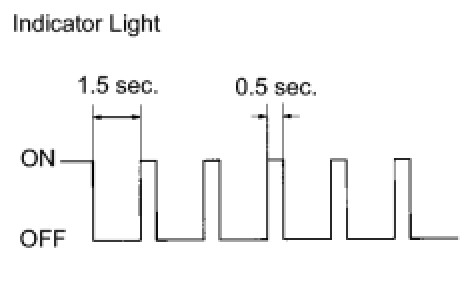 (c) While driving with cruise control, the ECM activates AUTO CANCEL of the cruise control system when a malfunction in one of the following occurs: vehicle speed sensors, stop light switch or other related parts. When AUTO CANCEL is activated, the CRUISE main indicator light outputs the blinking pattern shown in the illustration. At the same time, data of the malfunction is stored in the ECM as a Diagnostic Trouble Code (DTC).
