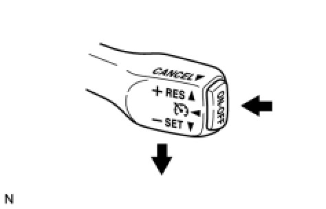 (f) Momentarily (approximately 0.6 seconds) push the cruise control main switch to -/SET and then release it. Check that vehicle speed decreases approximately 1.6 km/h (1 mph) with each cruise control main switch operation (tap-down control).